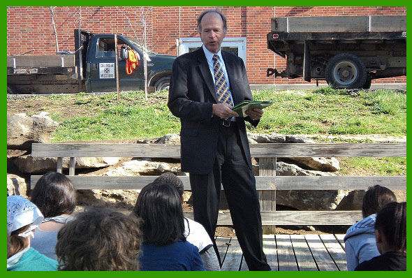 Columbia mayor, Bob McDavid, presented Treetures story/science books, donated by the Treeture Program, to the school library. |