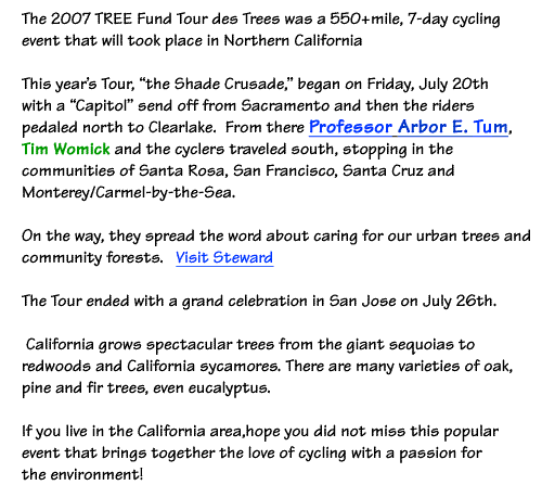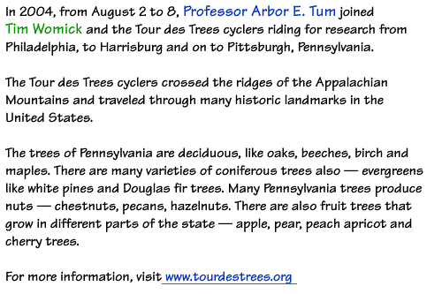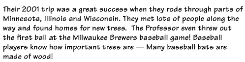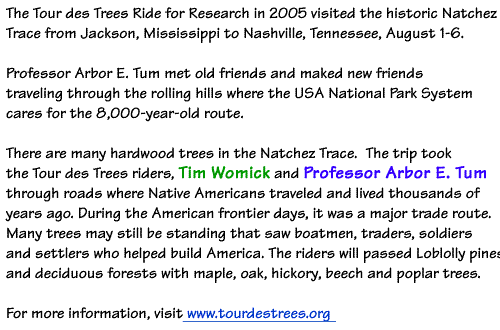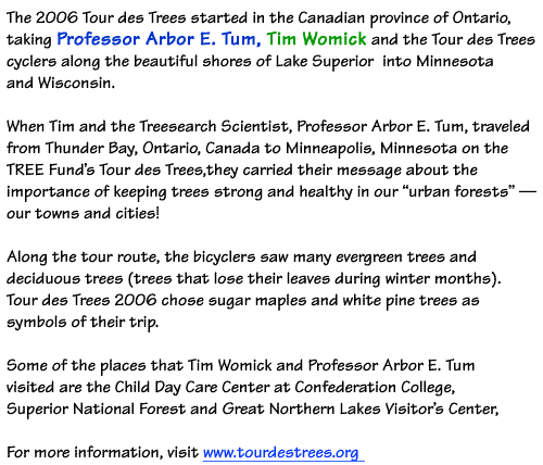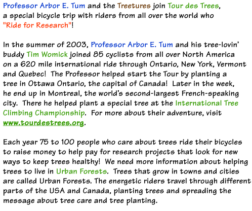 Professor Arbor E. Tum is proud of all the good people he rode and worked with and how they planted trees and raised money to help tree research scientists find ways to make trees grow stronger and healthier in urban forests.