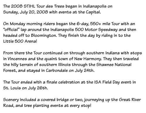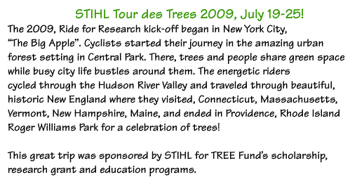 Some tour fundraisers are and were, Britton Fund Ride, ISA, WISA, The Tree Fund, STIHL for Tour des Trees, Davey Tree Expert Company and National Tree Trust.