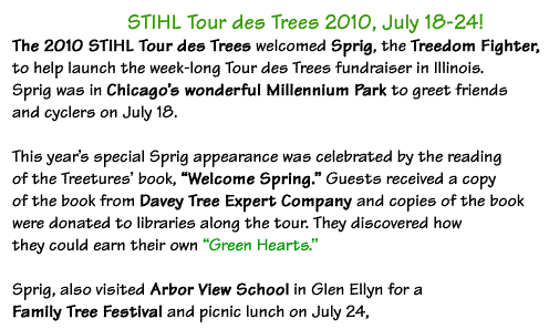 Tim and Professor Arbor E.Tum, the TreeSearch Scientist, stopped along the way to entertain and teach kids about the gifts of trees and show off his team’s tree climbing talents. Sometimes Sprig, the Treedom Fighter, Professor Vinca Vinestein, TreeSearch Scientist, and other Treetures joined them.