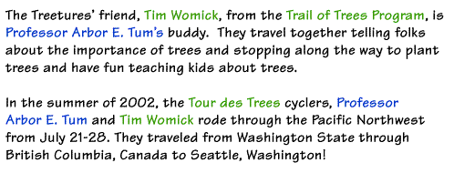 A small group of tree-loving cyclists realized, many years ago, how important tree research was to keeping trees on earth healthy as more and more towns and cities began using green space for building homes and communities with less and less space for trees to grow and give us their special gifts.   Soon so many riders were touring the country and other countries that an organization called The Tree Fund was created. Sponsors from companies contributed to the tours, along with riders. Enthusiastic riders joined the trips each year, especially the Treeture’s friend, Environmental Entertainer, Tim Womick on his Trail of Trees and today, with his TreeCircus.
